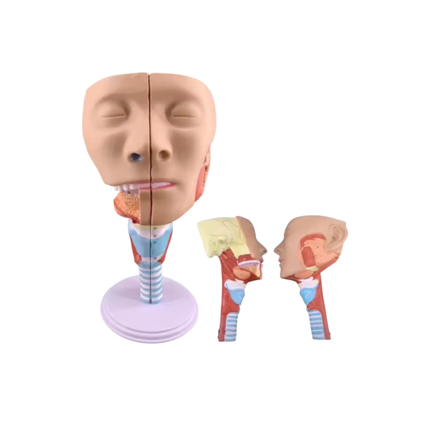 An anatomical model made from eco-friendly PVC, designed with a median cut for clear internal visualization. Displays the throat muscles and pharyngeal wall, nasopharynx, laryngeal structures, submandibular and sublingual glands, including the cricopharyngeal muscle. Ideal for anatomy teaching and medical education.
